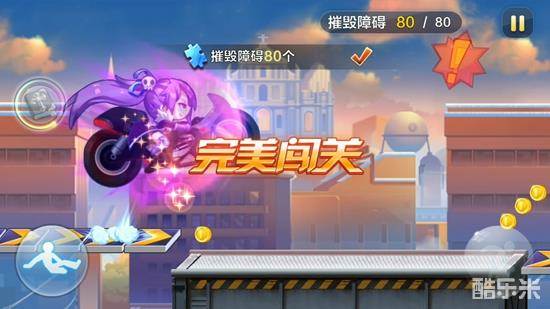 本关限定了角色审判女王和坐骑暗影战车,因为完美通关要求是摧毁80个障碍,所以不必考虑得分因素。但需要注意是,这里的审判女王是2跳滑角色,没有宝物的加成无法3跳滑,在第2跳时按着不松滑翔,所以要注意前方突然铺设或消失的路面,提前起跳。