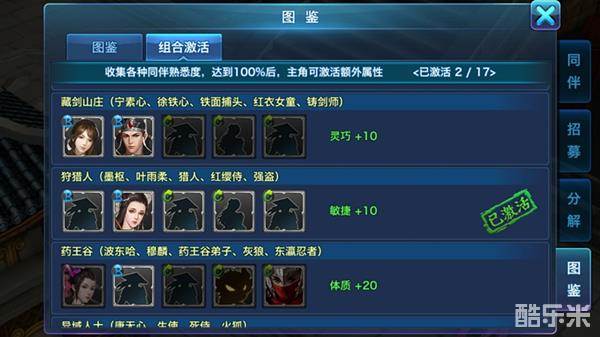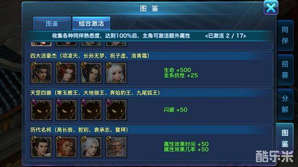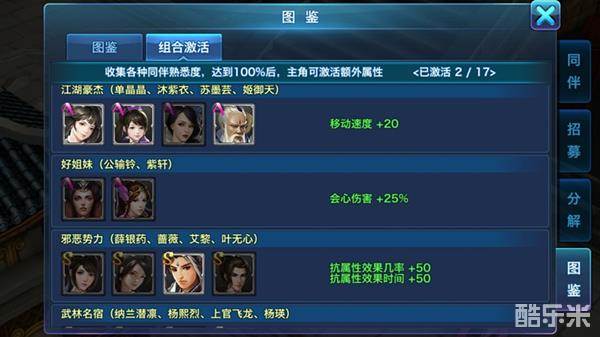 ①特定伙伴上阵激活组合属性,增加角色 属性