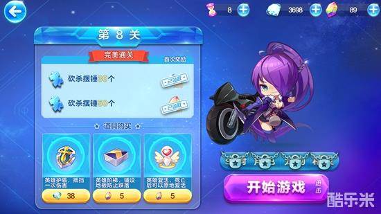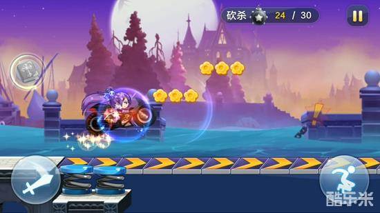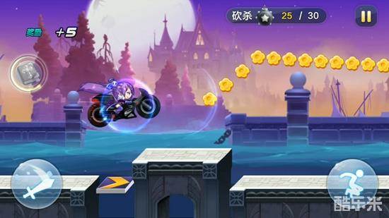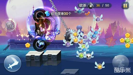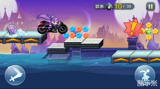 本关的模式是进击模式,完美通关要求砍杀摆锤50个!这里要注意,限定了是砍杀摆锤,所以砍杀其它障碍是不计数的。本关属于限定关卡,限定角色审判女王,以及坐骑暗影战车。审判女王是2跳滑角色,所以跳的时候一定要谨慎。