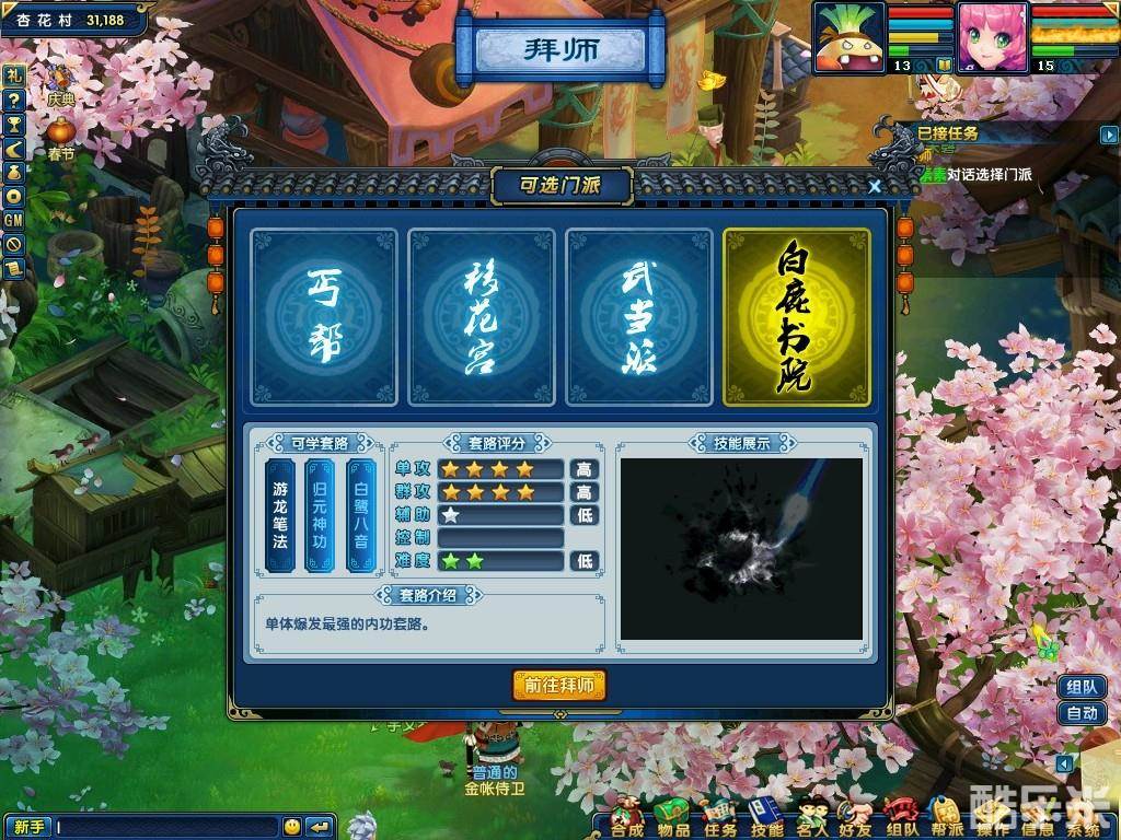新手任务环节中最重要的一个环节,选择加入哪个门派。作为一个大家都心照不宣的江湖规矩,选择任意一个门派后都不允许再更换门派,因为尊师重道是行走江湖的重要准则。所以在选择门派时定要了解清楚各个门派的类型,是否符合自己需要。想了解各个门派吗?请点击八大门派