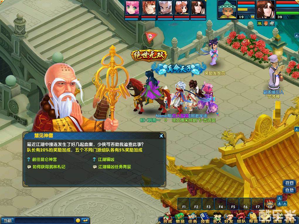 人物等级达到25级后,可组满5人队伍找汴京NPC慧见神僧(228,127)领取江湖缉凶任务。任务每10环为一轮,完成第10环,经验和物品奖励都非常丰富,是快速升级和赚钱的捷径。江湖缉凶任务作为队长还会有较高的额外经验加成。