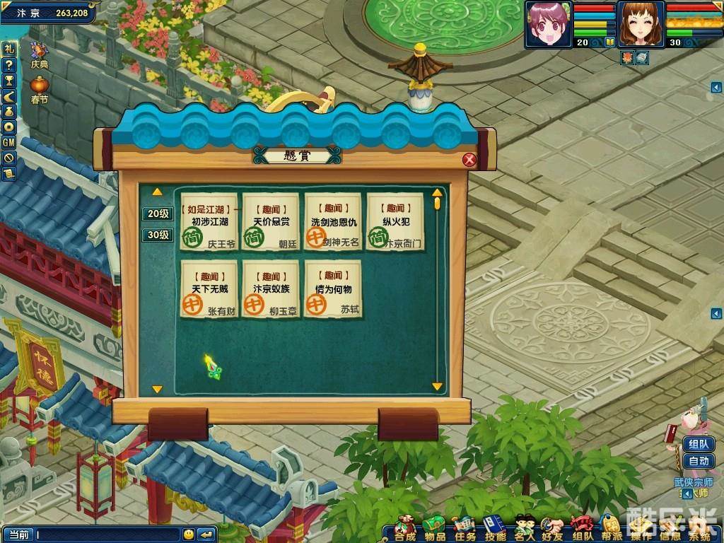 当角色等级大于等于20级后,可以在汴京的公告栏(258,206)处领取悬赏任务。悬赏任务中叙述着各种各样的奇人奇事,完成后可以获得丰富的经验、银票和各种道具奖励。