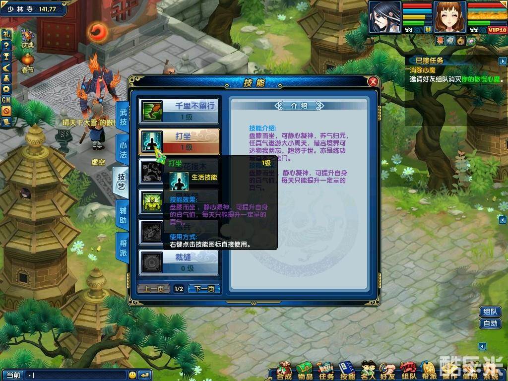 45级开放打坐技能,学会打坐之后,可以完成心魔任务,增加自己的经脉(修炼等级)。