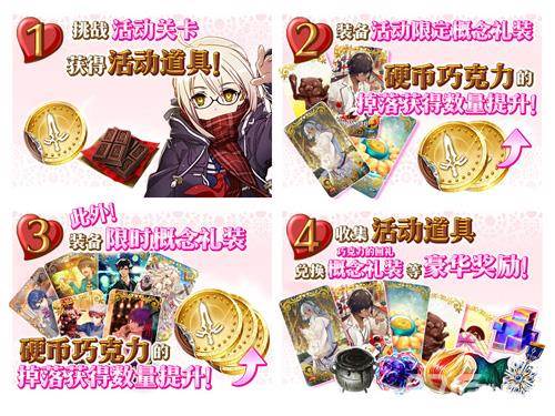 挑战迦勒底之门中的关卡,收集活动专用道具「各职阶硬币巧克力」,送给自己心意的从者来获得巧克力以及巧克力的回礼吧!