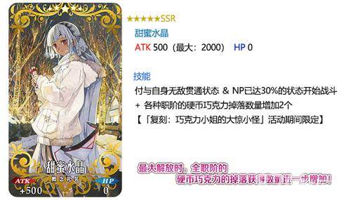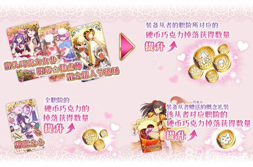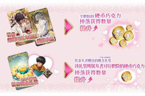 通过装备活动限定概念礼装「★5(SSR) 甜蜜水晶」「★5(SSR) 熔岩巧克力蛋糕」可提升全职阶的硬币巧克力的掉落获得数量。