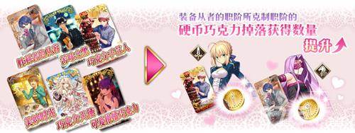 同时,装备从者处获得的巧克力·巧克力的回礼概念礼装可提升该礼装所属从者对应职阶的硬币巧克力掉落获得数量。