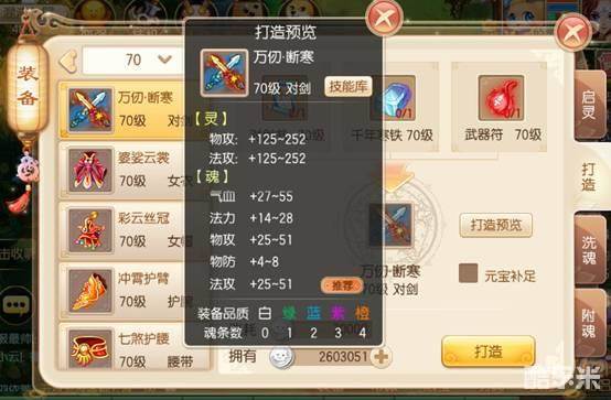 事先需要准备好材料,千年寒铁可以一次多买几个,因为各种装备都会用到。打造第一手如果是白、绿、蓝,那你可以休息一下喝杯茶什么的(不要抓狂连续打,否则会出更多低品质的装备),如果是紫装的话,那就可以稍作调整后,马上打造第二件,兜妹的橙装大多数都是这么出来的!