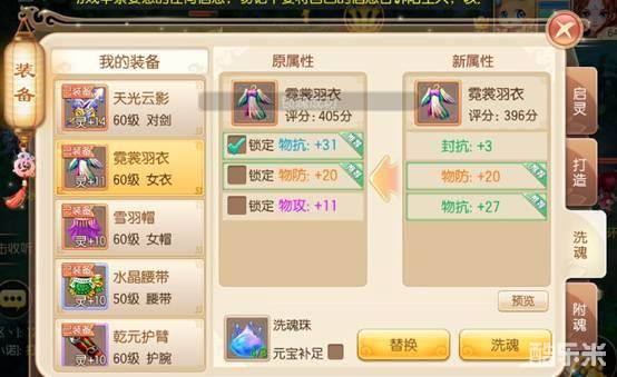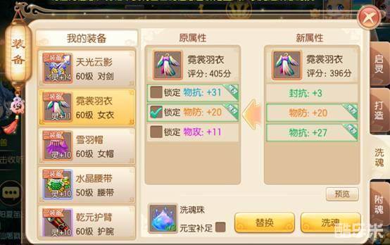 一上手兜妹就洗出了物防+20的橙色属性,立刻替换,并且用锁魂珠绑定。之后很快就洗出了另一条蓝色物抗+31,果断替换~