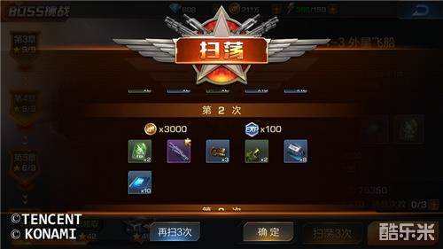 每天玩家都有1次机会,可连续扫荡3次挑战模式中的BOSS挑战关卡,每次都会消耗玩家10个体力值。而每次扫荡都会为玩家带来不少的武器零件,而且不乏高级的紫色武器零件。