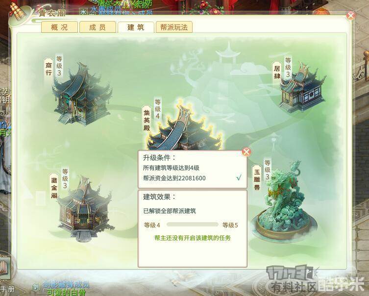 灵山奇缘这款游戏的帮会建设很简单,一共有五个建筑,分别是集英殿、商行、藏金阁、玉雕兽、居肆。它们的作用分别是解锁其他建筑、每日帮会可增加资金上限、帮会资金最大存储量、帮会容纳人数及帮会修炼技能上限,这些在游戏里有很明确的介绍,这里就不再重复了。