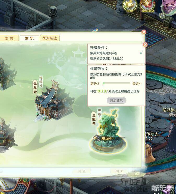 5,玉雕兽这个建筑可以根据帮会成员整体实力来选择性升级,以我的经验,50级、55级等级封印时各升级一次即可,甚至一直等到55级时升一次也可。前期没必要把玉雕兽升太高,实在是浪费资金与时间。