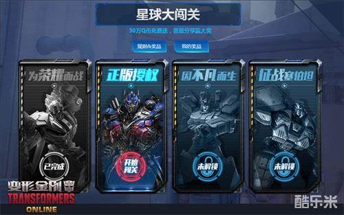 在游戏新大陆中,所有玩家都能接受到来自遥远塞伯坦星球的呼唤。其带来为荣耀而战、正版授权、因不凡而生、征战塞伯坦四大关卡考验,全面筛选真正的了解塞伯坦的战士进行福利发放,共计300000QB与大量变形金刚实物手办、《变形金刚OL》点券等待所有通过考验的战士领取!