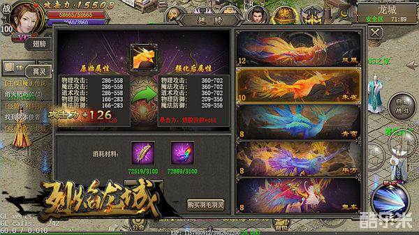 这个神奇的羽翼系统,设有五大翼灵:凤凰,朱雀,青鸾,毕方,鬼车,档次由高到低,每个翼灵强化的属性都不一样,可以极大地提升玩家的综合实力。强化翼灵需要羽毛和羽灵,同时翼灵和翅膀等级上线相互绑定,当等级到达一定程度时,超级酷炫的神鸟飞翔特效即可显示!