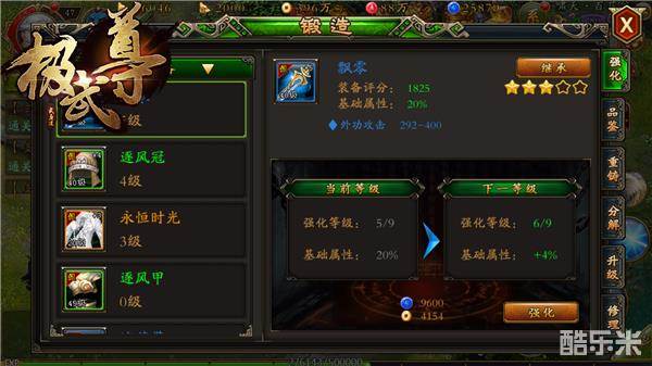 强化分为普通强化和高级强化,前者消耗魔灵和铜钱即可100%强化成功,后者随着强化等级的提高有一定几率失败。大侠获得新装备时,可将旧装备的属性继承给新装备,循环利用。