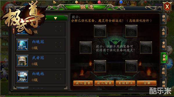 副本和任务会产出大量的装备,大侠可将不需要的装备分解获得魔灵,然后用于装备打造,但分解会消耗铜钱哦。