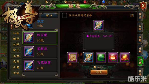 副本会掉落大量的升级材料,收集这些材料后便可以升级新装备。在升阶界面中大侠可以看到各种神装的秘方,根据秘方收集材料就好了。