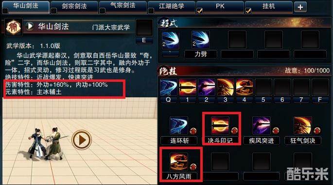 而华山技能分为三套(华山剑法、剑宗剑法、气宗剑法)第一套华山技能为大宗武学,随等级提升可进行提升,推荐升级技能(决斗印记,八方风雨)决斗印记为降低对方外功防御力,在珍兽岛boss时使用尤为便利,八方风雨为输出封禁招式技能,建议提升配合后期PK技能搭配练习。