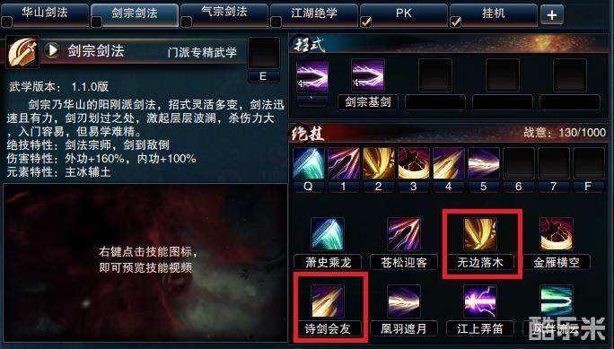 第二套技能剑宗剑法为20级习得,拥有华山的核心技能,适合PK且不能升级,只能佩戴相对职业套装增加技能伤害层数,推荐技能(无边落木,诗剑会友)