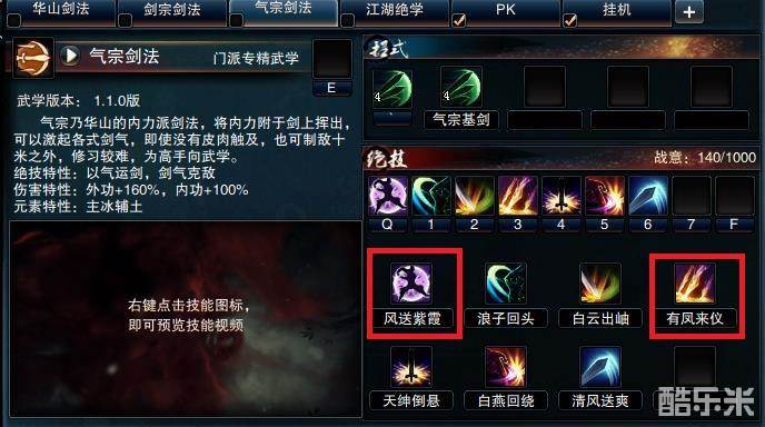 第三套技能气宗剑法为40级习得,华山后期群体PK与单P基本依仗第二三套技能结合,只能佩戴相对职业套装增加技能伤害层数,推荐技能(有凤来仪,风送紫霞)风送紫霞为刷怪神技。