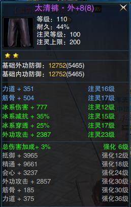 装备选择方面,必穿清虚装备,元素流洗炼属性冰伤、冰穿、冰减为最佳,属性流体魄力道外功属性。
