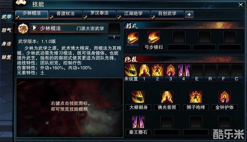 少林作为十一大门派里唯一一个以众多单身基佬组成的门派当然也有其特点,当然除了一颗可以照明的光头之外还有其他特点的。相信看过武侠小说的各位,对于少林这个门派的印象就是横练功夫强横,所以给人一种皮糙肉厚的感觉,而且其攻击招式也是刚猛无比,所以让人有玩西方游戏里的战士的感觉。当然,少林在笑傲江湖OL里也是充当类似战士的角色,肉、输出也不差,并且自身很多技能都带有刚体效果(刚体是减少大量所受到的伤害,并且无视出点穴、抓取、冰冻之外的控制技能)。