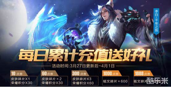 活动期间每日充值均可获得皮肤碎片、荣耀积分、大量铭文碎片等奖励,好礼送不停!