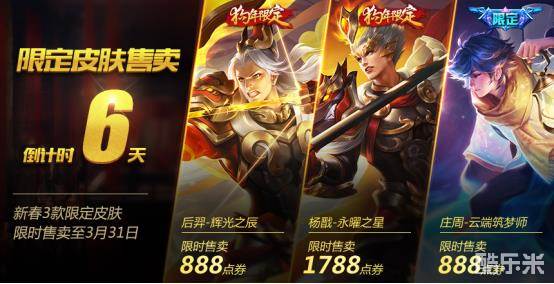 温馨提示:新春3款限定皮肤-杨戬-永曜之星、后羿-辉光之辰、庄周-云端筑梦师限时售卖将在3月31日结束,请各位召唤师抓紧时间购买~