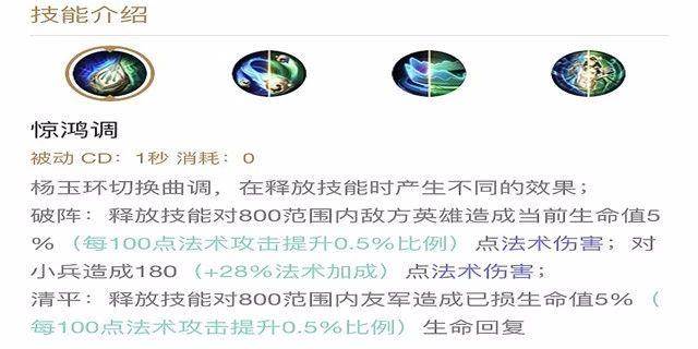 身为一个法师,肯定是以打出输出为主要目的。因此在团战开启时,先切换至“破阵”。在敌方英雄皆为满血的情况下,百分比附加的伤害非常之高。待双方互换完技能,都是残血的时候再切换为“清平”。理由前文开头已经交代,在敌方残血状态“破阵”对其几乎没什么伤害,而队友残血状态下“清平”循环放两轮技能基本上就全部半血恢复战斗力了,这也是杨玉环非ban必选的原因之一。