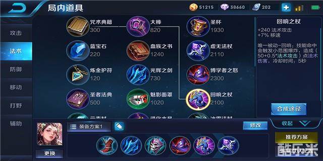 ①出装中非常难抉择的一点是第一件是否要出巫术法杖。个人认为出巫术法杖最大的作用是其被动“强击”,但“强击”的加成是受法强影响的,在前期没有其他法强装备的支撑下没有太大必要。个人习惯是先只出一个“光辉之剑”,在面具帽子做完之后再将其合成巫术法杖。前期的杨玉环是十分缺少蓝量的,“光辉之剑”所带来的附加蓝量可以勉强凑合,无须出圣杯。