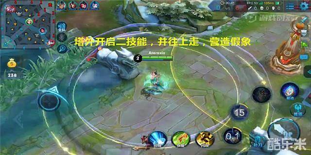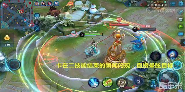②有一个小技巧,对线期敌方英雄残血塔下回城时,(熟练的杨玉环几乎每盘都能做到将敌方中单压制至残血回家这一点,)玩家可以在塔外开启二技能,掐好时间点闪现进塔眩晕住敌方,让其无法按出闪现,进而配合一技能和加强版普攻将其击杀。这是一个非常秀也非常令人意想不到的操作。如下图所示: