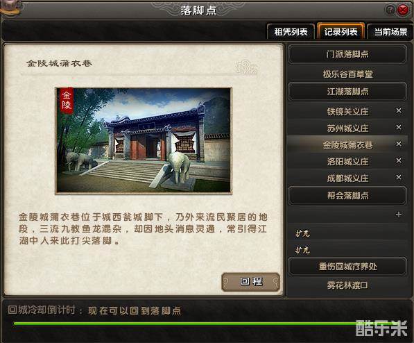 添加落脚点:使用快捷键“T”呼出落脚点面板→打开分页“当前场景”→选择列表中任意一处复活点→点击添加便可把选择的复活点记录为落脚点。使用落脚点:使用快捷键“T”呼出落脚点面板→打开分页“记录列表”→选择列表中任意一处复活点→点击回程→同意后便可回到该落脚点。扩充落脚点:江湖落脚点一共有5个位置,系统默认开启一个,其余4个需要花费些许碎银或整银扩充。删除落脚点:点击记录列表中任意落脚点后面的“X”便可删除该落脚点(门派落脚点无法删除)。租凭落脚点:当系统提供的江湖落脚点不够用时,可以通过花费整银来租凭额外的落脚点,使用时限为30天,到期后可续费。记录重伤疗养处:与落脚点处的云游医师对话即可将该处落脚点记录为重伤疗养处,当您死亡后可选择回到该处治疗,或在死亡复活时限结束后将自动回到重伤疗养处。