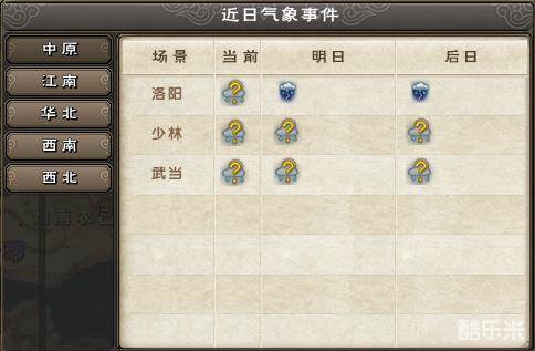 点击地图上方,可以查看各个场景今、明、后三天内的气象事件。特殊的天气可是能触发不同的天气玩法的哦~