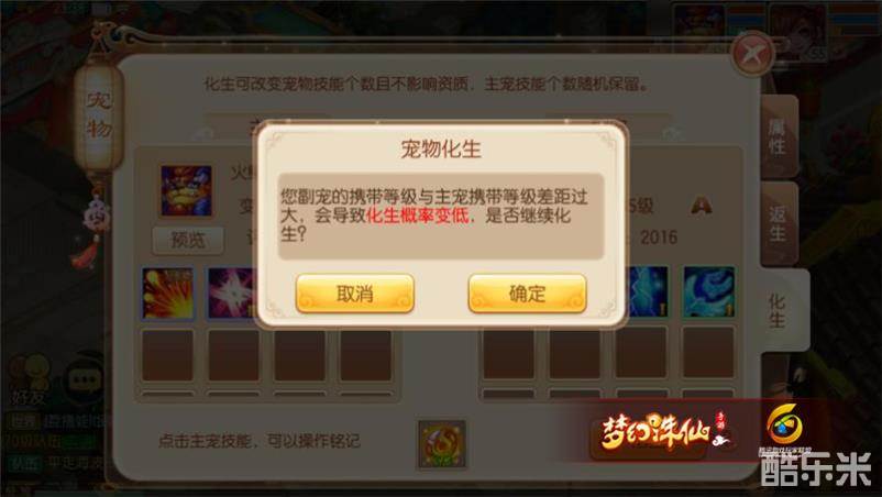 化生时最好选择携带等级不低于35级的宝宝为副宠,携带等级太低化生成功率会大幅降低。化生副宠优先选择法攻型宝宝,选择其余火麟兽为化生副宠时,相同技能不能重复化生到技能栏中。