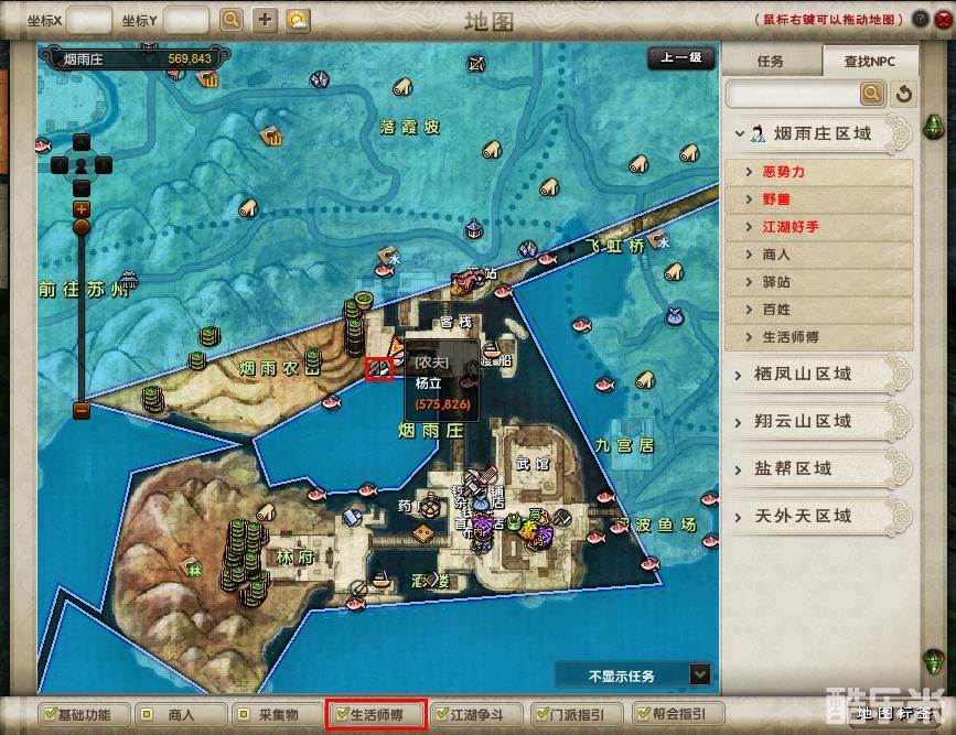 【小贴士】在上述城市中,玩家可按M键打开大地图界面,界面下方勾选“生活师傅”即可在地图中找到农夫师傅所在位置。