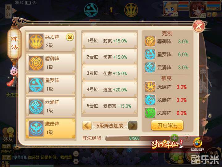鹰击阵是集合封抗、伤害、速度、免伤四类技能为一体的全面型阵法,比较适合多门派集齐的队伍。1号位主位是封抗属性,1级增加封抗9%,5级阵法可提高至15%;第二位和第三位都是增加伤害属性,最高可增加15%的伤害输出;第四位是增加12%速度,到达五级可增加20%,是最高的速度加成;五号位则是减免伤害,也是相对比较有利的属性加成。九大阵法因属性的不同,相互之间牵制,生息相克,所以鹰击阵在克制盾御阵、星罗阵、云涌阵的同时,也被虎啸阵、龙腾阵、风疾阵克制。这就意味着在与盾御阵、星罗阵、云涌阵对战时,我方阵容属性分别加成3.0%、6.0%、3.0%,而与虎啸阵、龙腾阵、风疾阵对战时,我方属性分别降低3.0%、6.0%、3.0%。所以,在我们实际对战中,选择正确的阵法对队伍是否取胜也有着至关重要的作用。