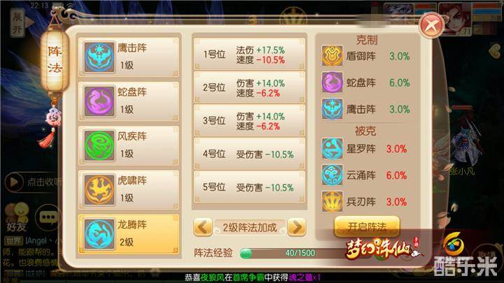 龙腾阵的1号位法伤+17.5%,速度-10.5%;2、3号位伤害+14%,速度-6.2%;4、5号位受伤害-10.5%。