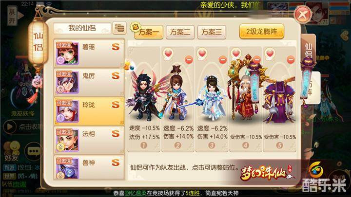 2、3号位:伤害增益明显,速度略减。建议携带输出高但对先手需求不明显的仙侣,如:兽神、鬼厉、碧瑶、陆雪琪、小白、张小凡等。