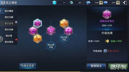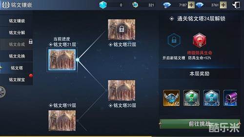 解锁铭文槽是玩家角色镶嵌铭文的前提,每个人物角色都有8个铭文槽,每通关4层会解锁一个新的铭文槽。挑战铭文塔可以获得铭文宝箱、铭文精华,每天零点系统还会以当前通关层数作结算,奖励更多铭文精华。此外,通关第56层铭文塔还可以开启铭文合成功能。