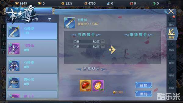 2、装备重铸:装备重铸需要重铸石才可以重铸,重铸会出现随机属性,更有机会获得特殊属性。