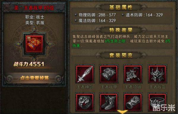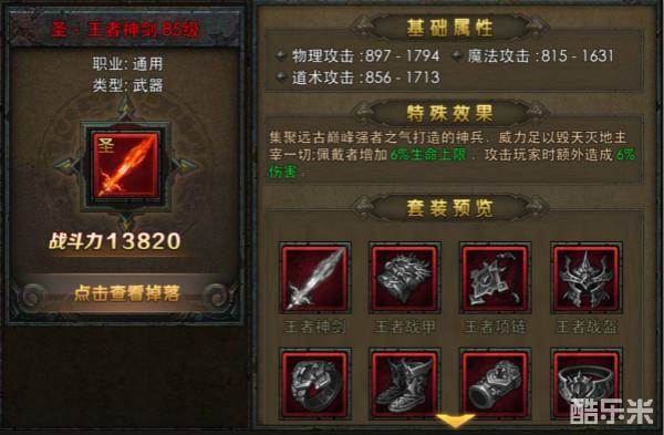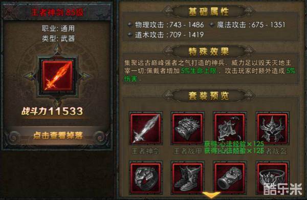 王者装备的穿戴等级是85级,这意味在前期如果能获得王者装备在刷怪和PK上能大大领先其他玩家,而且炫酷的外形也是装逼神器。