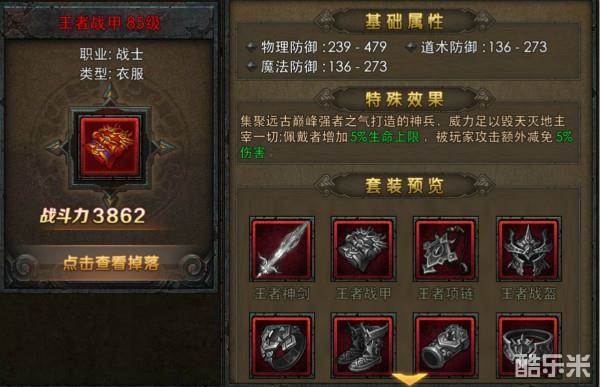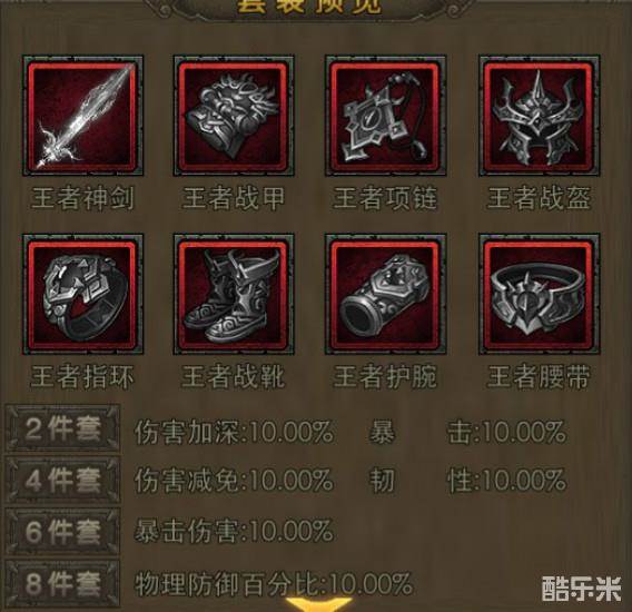 王者神剑和王者衣服特殊效果的加成是其他部件的两倍,王者戒指与王者护腕的加成与王者项链的加成是一样的,王者战鞋与王者腰带的加成和王者头盔的是一样的,这意味着集齐8件套能加25%的生命,加12.5%的pk伤害,加12.5的pk减伤,这是其他装备所没有的,而且王者装备的套装效果也是十分强大的:
