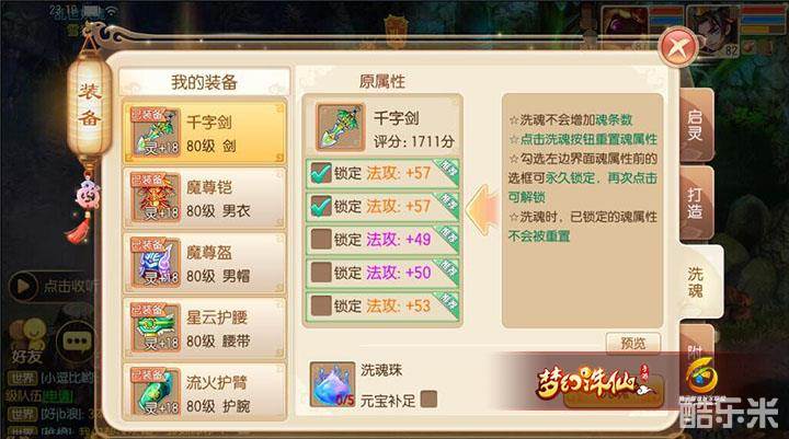 关于洗魂方面,大神给本梨全面科普了1000元宝洗5魂的方法,现在分享给大家。还是以武器为例,洗出第一个满意的法攻以后将它锁住,接着洗出第二个替换,接着洗出第三个,此时需要把第一个的锁解锁,锁住第二个,替换。之所以这么做,是因为锁住的魂洗的时候是不会变的,如下图: