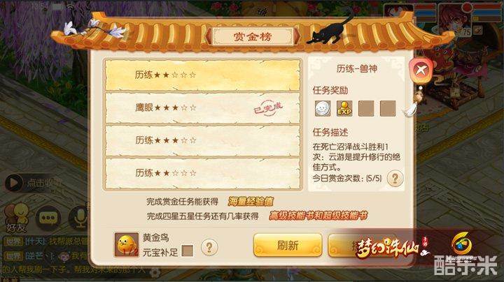 在任务板上没有5星任务的时候,需要用黄金鸟或元宝来刷新,如果连续刷新2次30元宝的还没有刷新出5星,就不要不停的刷新了,可以先接一个3星任务,完成后再用20元宝刷新。如果没有元宝刷新任务,接一些3星任务也是可以的,3星任务会给鬼谷残卷,如果能合成一本兵刃阵,还可以卖1万多金币。当然,宠物技能书的价格差异较大,如果运气不好获得的都是便宜的技能书,还是会亏本的。但是如果不刷4星、5星任务的话,是无法得到高级技能书的。总之,将元宝花费在刷新赏金上,还是比较划算的一种方式。