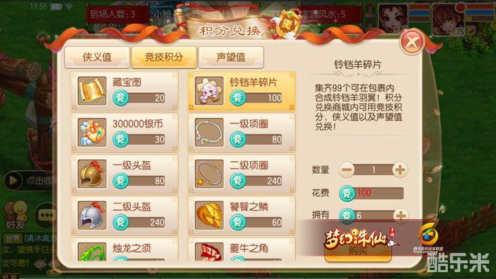 在商城通过积分还可以兑换道具,积分包括侠义值、竞技积分和声望值,侠义值兑换的龙晶、修炼丹和法阵可以直接换成金币,竞技积分的是藏宝图和五宝,藏宝图可以去挖宝,五宝应该根据当前价格最高的来买,不建议用五宝去换乾坤灵宝图,乾坤灵宝图虽然比普通的藏宝图奖励好,但是会放宝宝,有时候挖到的东西价值还不如五宝的成本高。声望值兑换的五彩琼华和流光炫彩也可直接换成金币。最近在积分商城新增了铃铛羊碎片,想要翅膀铃铛羊的不妨都把积分换成碎片。