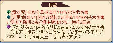 天罗地网:对敌方随机3名角色造成142%的法术伤害,使友方随机2名闪避率增加15%,持续2回合。