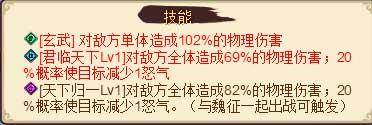 君临天下、对敌方全体造成69%的物理伤害。20%的概率使目标减少1怒气。