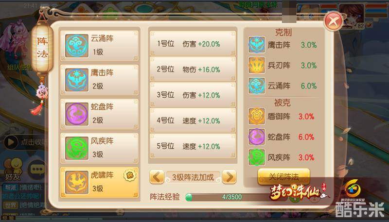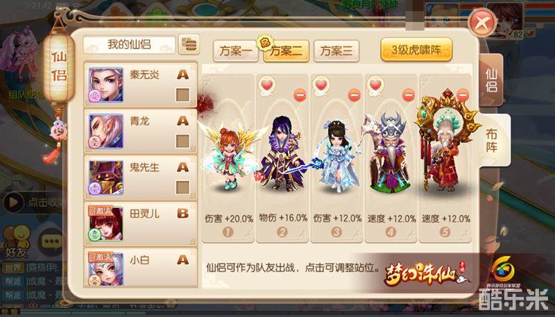 虎啸阵适用于大部分关卡:1号增强伤害位还可以增强治疗效果,提高玩家续航能力;2号增强物理位提升效果显著,从而我们可以将物攻强力的仙侣放在这个位置上;3号增强伤害位适用于任何类型的输出;4号位和5号位具有提高速度的效果,我们可以放置两名辅助仙侣在该位上。