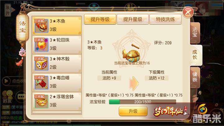 木鱼的自带属性为法防,最高可以增加角色150点的法术防御。法宝等级以及星级可以提升属性值,法宝等级上限16级。