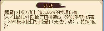 太乙仙剑:对前排造成139%的物理伤害;35%概率眩晕吴彪持续1回合。