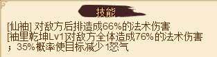 袖里乾坤:对敌方全体造成76%的法术伤害,35%的概率使目标减少1怒气。